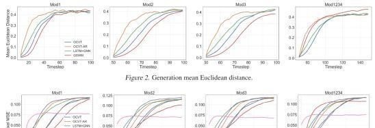 尽管如此,OCVT仍然可以合理地学习动态,优于其他基线。此外,GSWM的训练程序相比OCVT需要四倍长的时间来收敛,这也会导致不稳定的训练,尤其是对于较长的轨迹,Mod1234实验证明了GSWM不能很好地学习动力学。