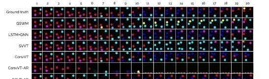 例如,在第7帧中,它错误地预测紫色球应该变成黄色而不是青色。类似地,LSTM+GNN和ConvVT错误地预测了球的颜色(例如,对于LSTM+GNN,第10帧处的紫色球和对于ConvVT,第10帧处的蓝色球),同时也具有比GSWM更差的动力学预测。SVVT的动力学性能甚至比其他模型差,而且还可以预测混合颜色的球。